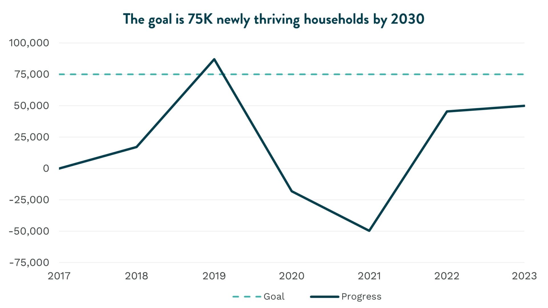 Decreasing affordability in San Diego threatens progress toward all the goals and disproportionately impacts communities of color. Household incomes have not kept pace with the cost-of-living reflected in basic household needs such as transportation, grocery expenditures, and childcare, leaving only one in 10 households able to afford the median-priced home in the region. As of 2023, San Diego has added 49,916 newly thriving households (chart below) bringing the total number of San Diego’s thriving households in the region to 610,983—51.7 percent of total households.